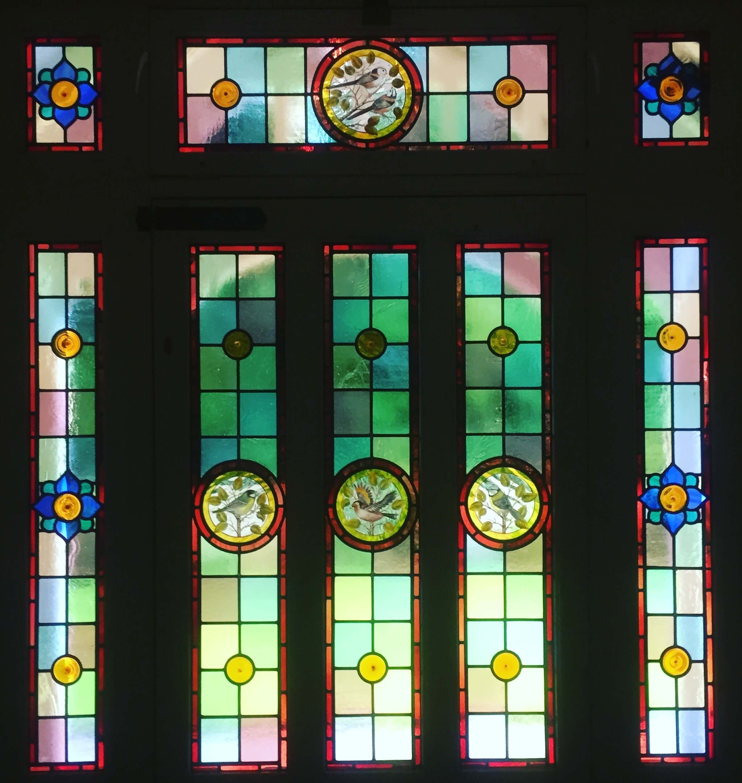 A beautiful suite of windows using pastel tones, mouth blown ruby border and hand painted stained glass birds.